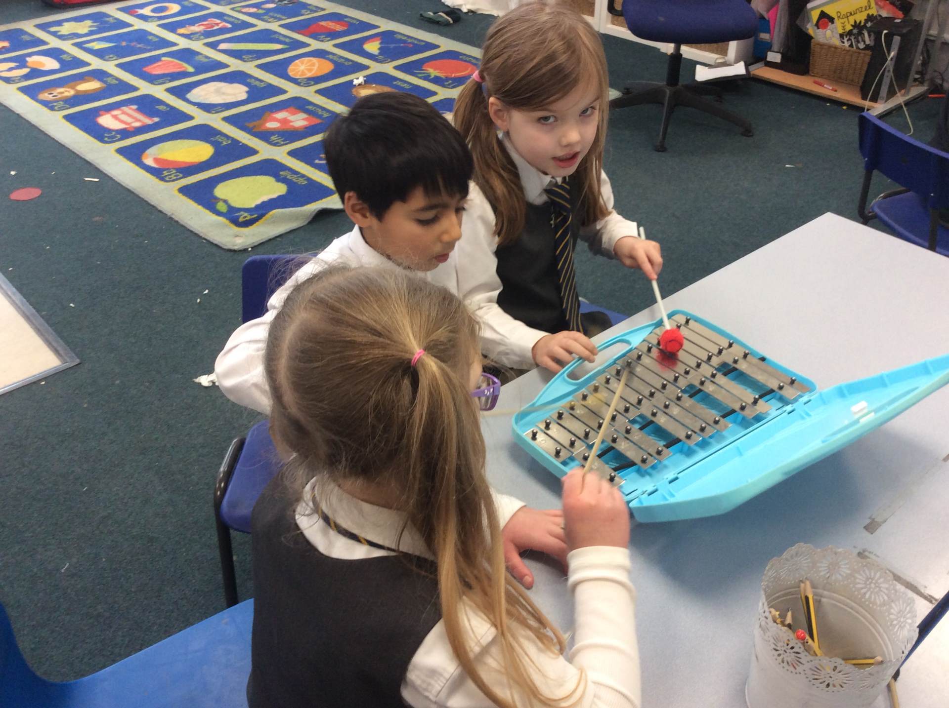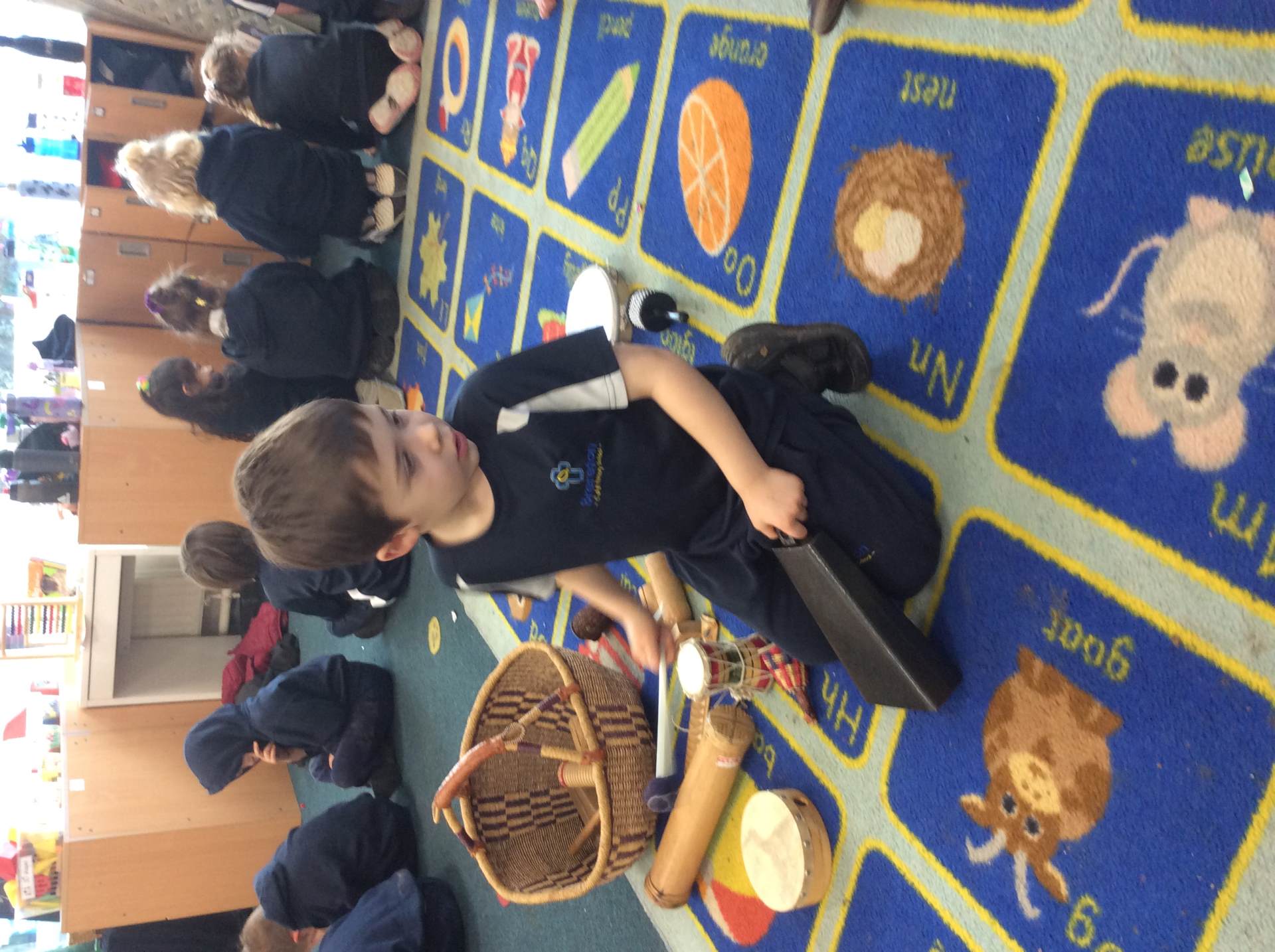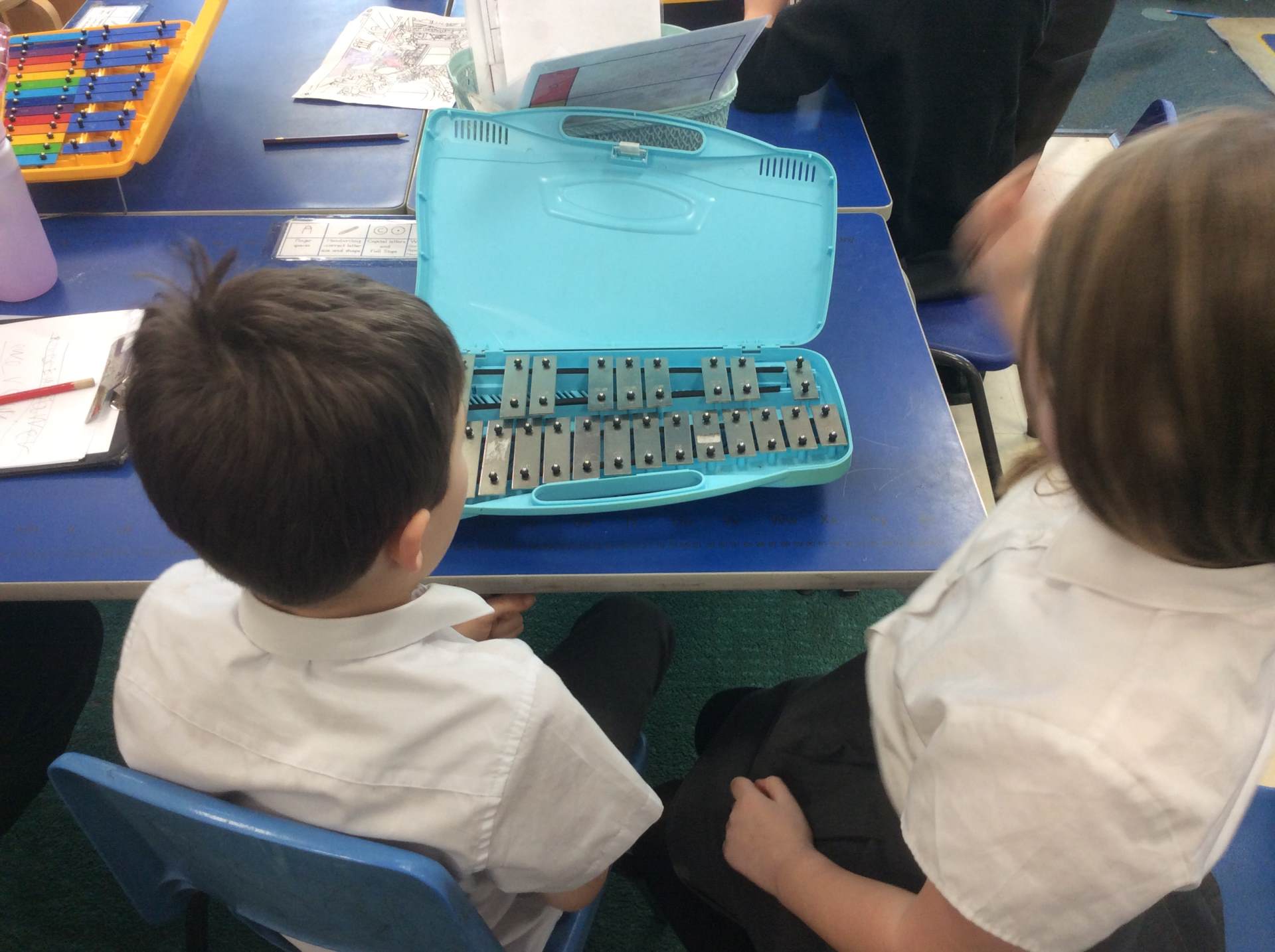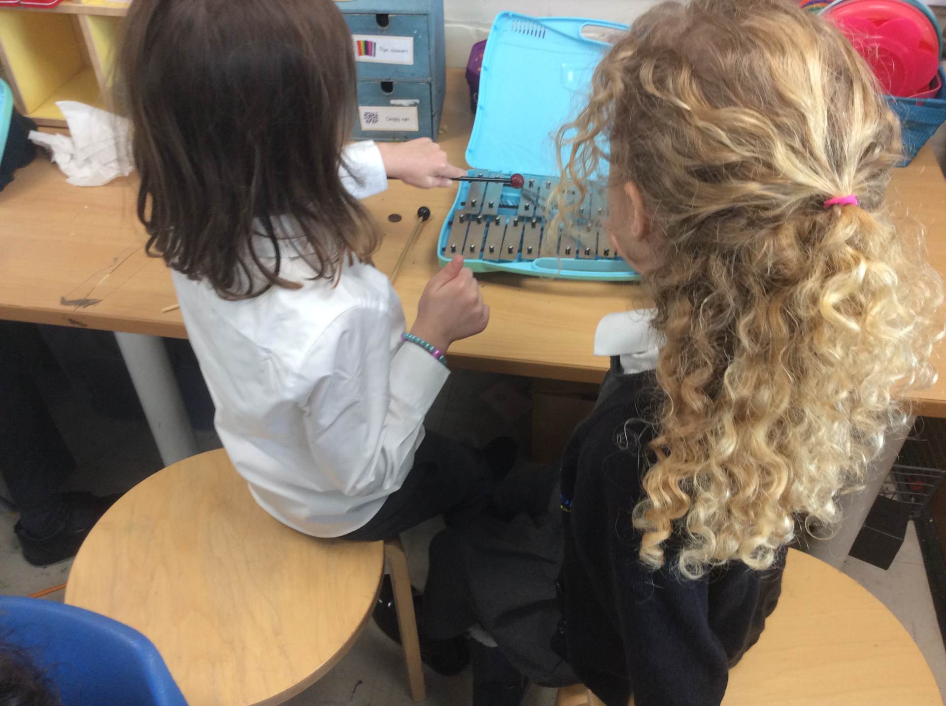 We discussed what we could hear, shared whether we liked the song, enjoyed dancing with our friends and played the glockenspiel with a partner to the song. We had lots of fun!